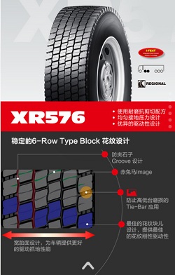 XR576使用耐磨抗剪切配方、均勻接地壓力設(shè)計(jì)以及優(yōu)異的驅(qū)動(dòng)性設(shè)計(jì),寬胎面的設(shè)計(jì)為車輛提供更好的驅(qū)動(dòng)抓地性能。同時(shí)采用更加穩(wěn)定的6—Row Type Block花紋設(shè)計(jì),包括防夾石子Groove 設(shè)計(jì);赤兔馬Image;防止高低臺(tái)磨損的Tie—Bar應(yīng)用;最佳的花紋塊兒設(shè)計(jì),提供最佳的花紋剛性驅(qū)動(dòng)性。